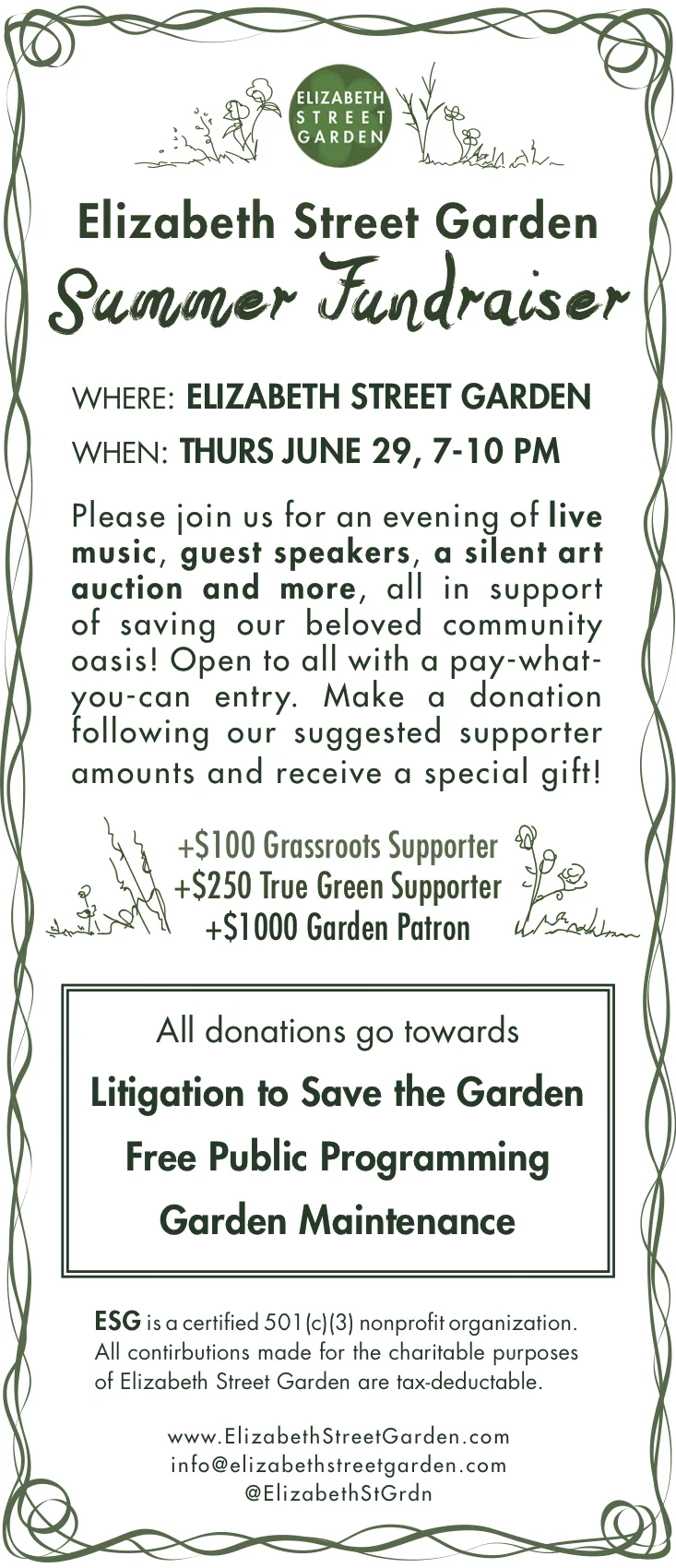 ESG is a certified 501(c)(3) nonprofit organization. All contributions made for the charitable purposes of Elizabeth Street Garden are tax-deductible.